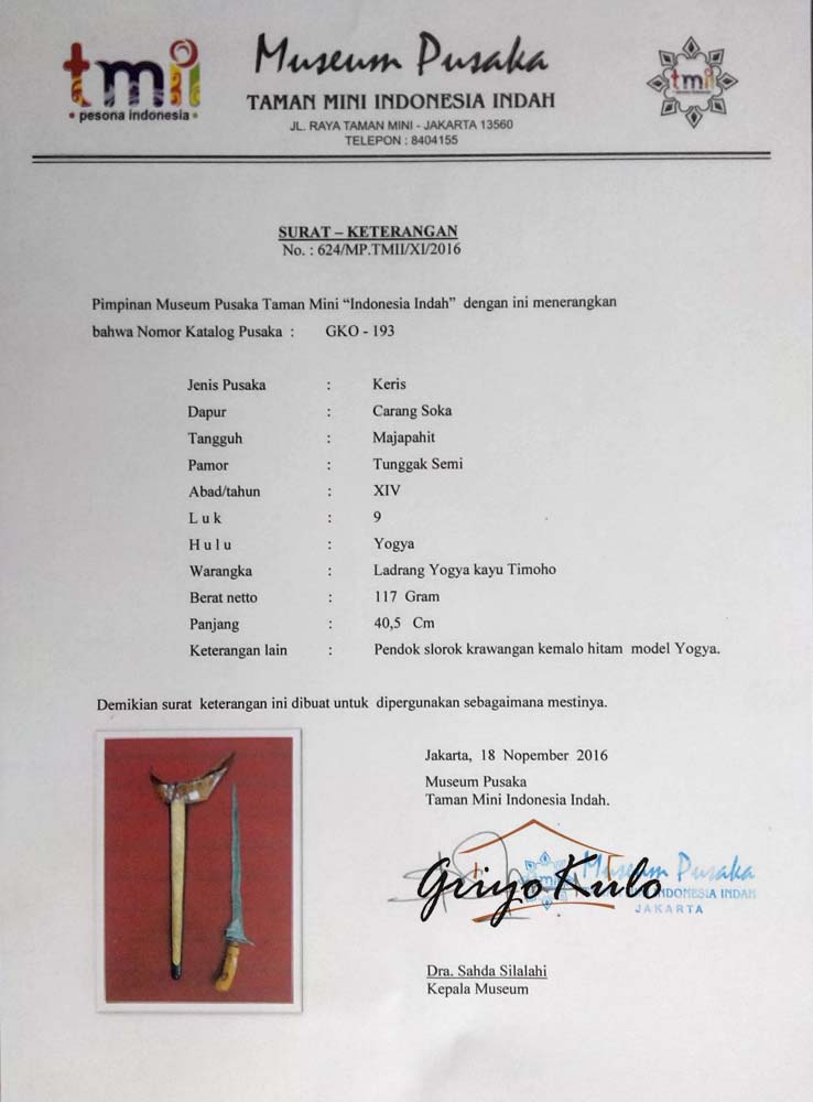 - Sertifikasi : Museum Pusaka TMII No : 624/MP.TMII/XI/2016