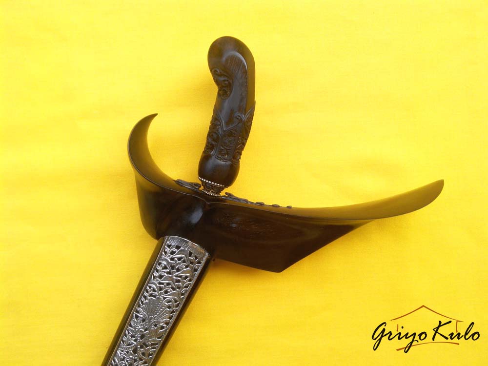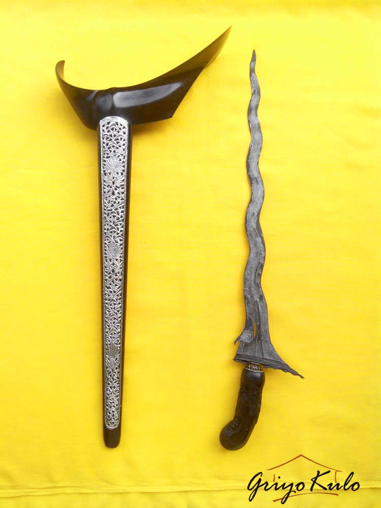 Dari perlengkapan pendukung yakni warangka tampaknya sudah tidak ada pekerjaan rumah kembali. Branggah Yogya kayu eboni disandingkan dengan ukiran tunggak semi putri kinurung dimana pada bagian hulu tersebut dikelilingi oleh ukiran stilasi tumbuhan atau taman bunga dengan tambahan makoro. Memiliki makna sebagai harapan menjadi seseorang yang bahagia, hidupnya dipenuhi dengan segala sesuatu serba berkecukupan dan berkelimpahan serta terlindungi dari hal-hal yang buruk. Dan pendok kemalo hitam dengan slorok buntu perak jaman dahulu memang sesuai dengan peruntukan bagi penerima tanda kehormatan gajah singo yakni untuk mantri panewu sudah terasa wangun (pantas).