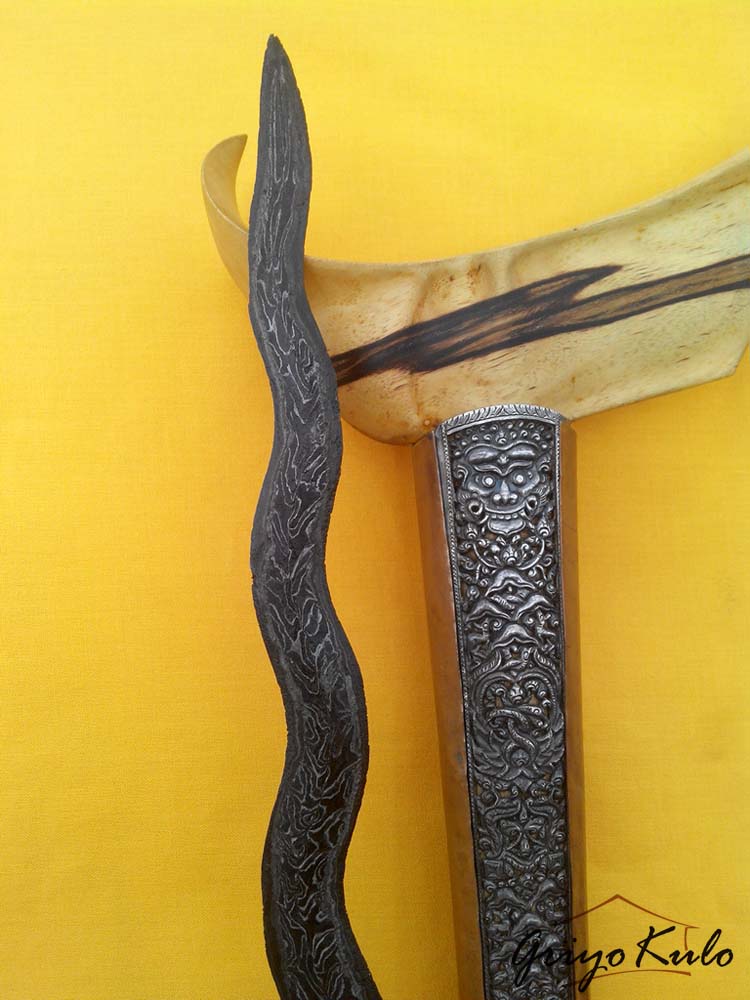 Pusaka tampak gagah dan miyayeni, disandingkan dengan pilihan warangka branggah yogya pelet kendhit yang banyak dicari orang dan pendok lawasan tembaga dengan slorok buntu yang terbuat dari perak dengan detail tatahan krawangan berbentuk buto makoro. Perpaduan yang seimbang antara sisi eksoteri dan isoteri.