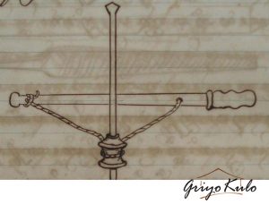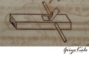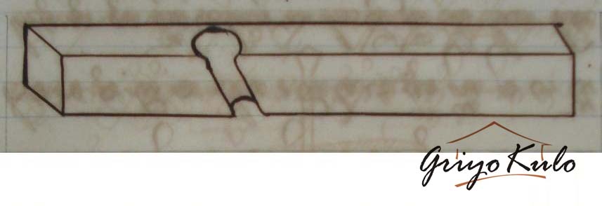 8. Dhalangan, kayu dibalik, sisinya berlobang sebesar landheyan, alat untuk meluruskan landheyan, bentuknya seperti dibawah ini:[hal.23]