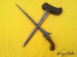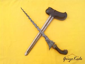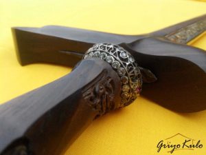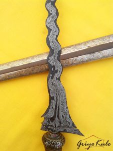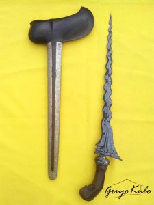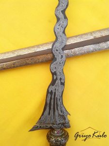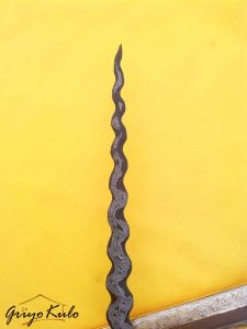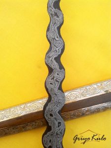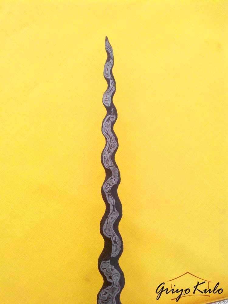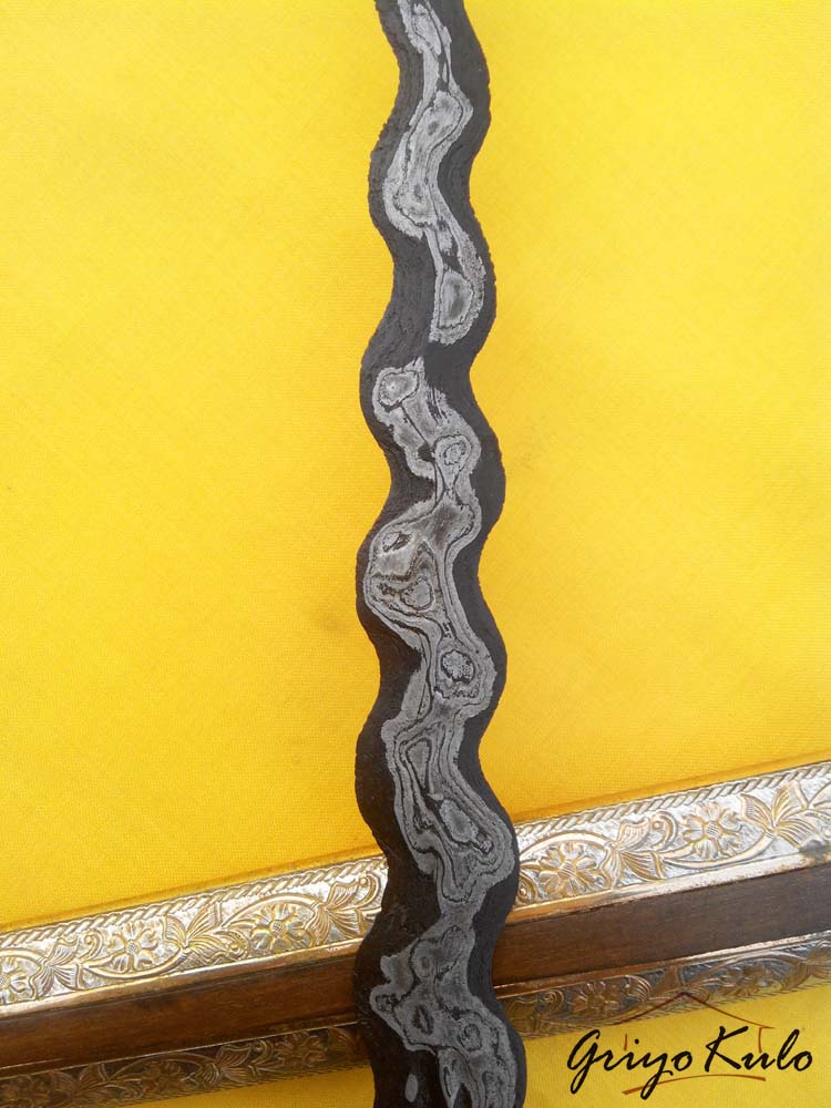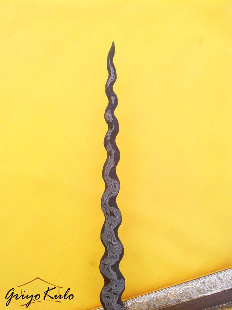TENTANG TANGGUH, penampilan nyatriyo dan merbawani bisa dirasakan ketika menanting pusaka ini. Menata lekukan dengan jumlah 23 dengan rasa luk semakin ujung semakin rapat dan dalam koridor panjang bilah yang masih dibilang normal (lebih kurang 37 cm) merupakan tantangan tersendiri bagi sang Empu, terlebih jaman dahulu pembuatannya dengan cara di-odot (tarik). Tantingan bilah terasa super ringan, besinya berserat hitam legam, jika diminyaki tampak seperti bulu gagak. Kitab-kitab lama menyebutnya dengan besi ‘kenur‘, asalnya dari dalam samudera. Apabila disentil suaranya ‘prung’, jika dilihat lama-lama menimbulkan rasa gemetar. Jika dijadikan pusaka dipercaya dapat membuat pemiliknya menjadi teguh hatinya, dicintai banyak orang,  dan semua keinginannya dapat tercapai. Jika dipakai untuk berdagang akan sanggup memberikan hasil. Bulatan-bulatan pamor meteoritnya sebagai perkawinan ‘ibu bumi bapa angkasa‘, meski warangan lama kontras menyala seolah royal dalam melukiskan tetes-tetes air hujan (udan mas tiban?). Sangat jarang Penulis menjumpai keris kalawijan dengan garap besi tak sembarangan dan pamor seroyal ini. Bagian sogokan dibuat sangat tinggi, lambe gajah runcing ke depan , serta bagian panitis (ujung bilah) yang agak menuding ke depan menambah prejengan tersendiri. Bentuk panitis yang unik ini oleh beberapa ahli tangguh kerap kali dicirikan dengan Tangguh Metesih, Empu Panedhas. Juga sebagai pameling untuk tidak mudah menunjuk (nuding) keburukan orang lain, karena disaat satu jarimu menunjuk orang lain, ke empat jari yang lain menunjuk diri sendiri. Karena tugas kita sebenarnya adalah mencari keburukan di dalam diri sendiri dan mencari segala kebaikan dalam diri orang lain. Bukan sebaliknya!