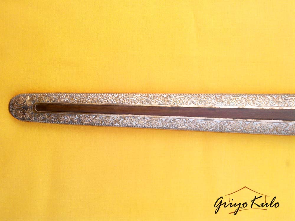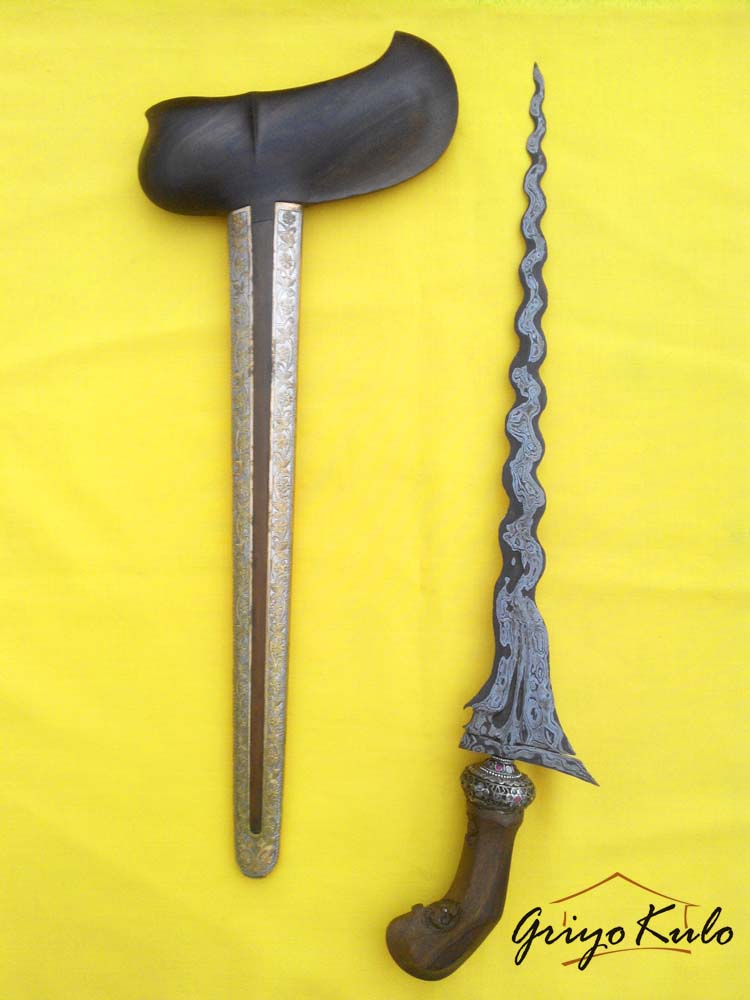 Warangka terbuat dari galih sonokeling tampak gagah mengiringi. Sonokeling merupakan salah satu kayu eksotis Jawa, di mana bagian tengah kayu berwarna hitam gelap dengan urat-urat kayu yang sangat indah. Kayu kehitaman dengan nuansa kehijauan, keunguan, kekuningan, kemerahan, tergantung lokasi dan jenis tanah di mana dia hidup. Keindahan motif seratnya merupakan rekaman perjalanan hidupnya. Kayu sonokeling kini semakin langka, tak ayal harga per kubiknya saat ini di atas kayu jati.