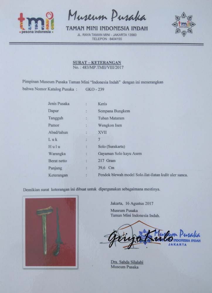 - Sertifikasi : Museum Pusaka TMII No : 483/MP.TMII/VIII/2017