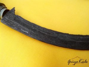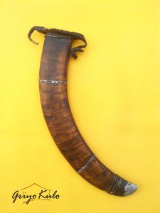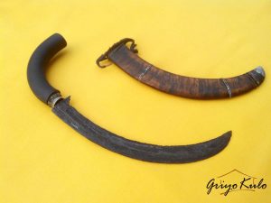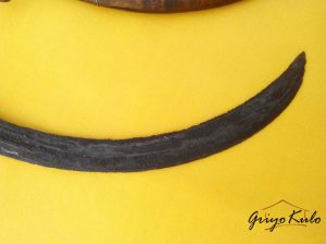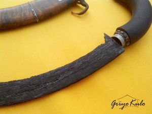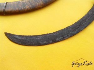 Jika diperhatikan bilah ini hampir mirip dengan Karambit yang berasal dari Sumatera Barat dalam dimensi yang lebih besar. Watak keras pemberani dapat dirasakan ketika mencabut bilah ini dari sarungnya, meskipun lengkungnya tampak cantik namun besinya tampak nggegirisi diselingi pamor yang tampak seperlunya, karena tujuannya bukanlah memamerkan keindahan pamor, tapi menjatuhkan mental lawan dari keangkeran besinya. Besinya tampak keras, seratnya tampak nyekrak (tajam) dan berongga kecil-kecil (besi bari semut?). Besi seperti ini biasanya terkenal sangat beracun, karena dari tektur besinya yang cenderung berongga kecil-kecil tampak lebih cocok jika ‘di-cacap‘ (proses perendaman bilah dengan cairan beracun, misal bisa ular, kalajengking dll), menyerap racun lebih cepat dan banyak daripada besi yang bertekstur rapat (pulen, Jw), namun dengan suara sentilan yang nyaring pertanda matang tempa. Untungnya ‘keangkeran’ bilah ini seperti dapat teredam ketika bilah dimasukkan ke dalam warangkanya. Warangka asli bawaan yang ada menampilkan motif kayu trembalu aceh yang unik, dimana seperti air laut yang disinari cahaya purnama, meliuk mengikuti kurva bilahnya. Sangat sayang untuk dilewatkan begitu saja.