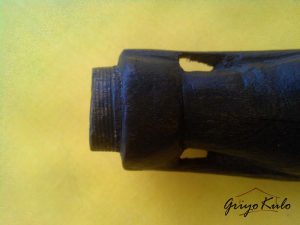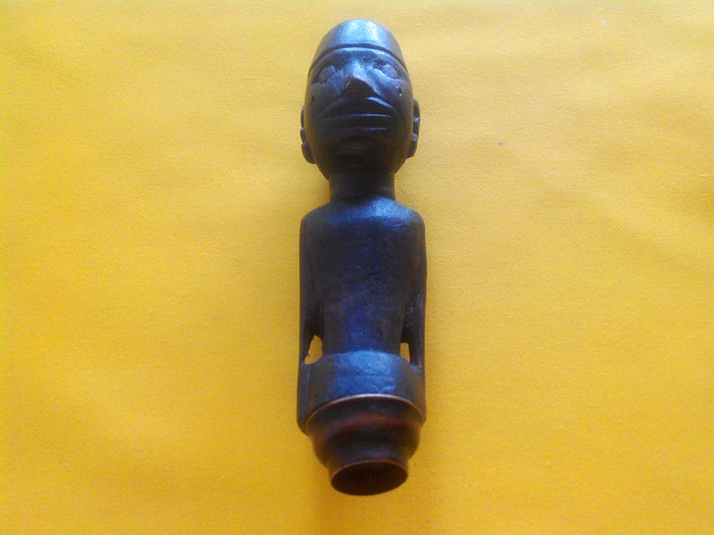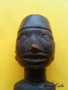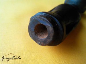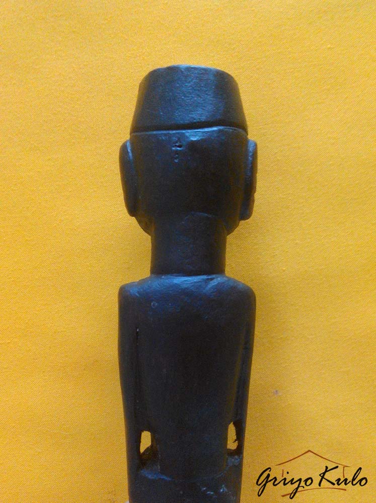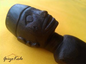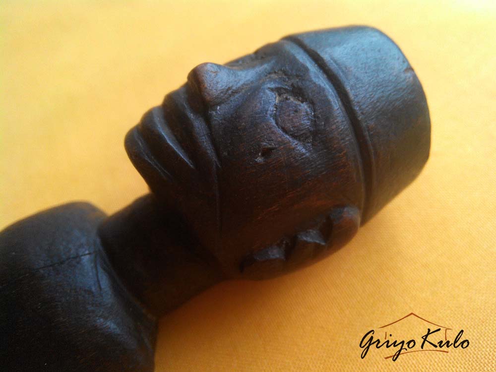 CATATAN GRIYOKULO, meski diukir secara sederhana (primitif) namun seolah hidup menampilkan figur tegap setengah badan seorang pemimpin yang gagah, tenang berwibawa lengkap menggunakan peci di kepalanya mirip Sukarno muda (Bung Karno). Bisa saja hulu ini dulunya dimiliki oleh seseorang dari daerah yang menganut paham Marhaenisme. Hulu ini juga masih dilengkapi dengan mendak bawaan sebelumnya yang terbuat dari kuningan dengan patina yang mengendap di permukaan hasil campur tangan sang waktu. Terdapat retak rambut alami sepanjang 2,5 cm pada bagian dada tengah dan bentuk hidung sisi kanan yang kurang sempurna lagi. Disebut retak rambut karena garis/celahnya tipis sekali mirip sehelai rambut. Secara keseluruhan masih dalam kondisi baik yang bisa diterima. Hulu kontemporer/kalawijan selain antik dan unik juga jarang ada duanya ini sangat cocok dipajang sebagai hiasan maupun disematkan pada pusaka klangenan Anda, terlebih jika Panjenengan seorang Nasionalis sejati.