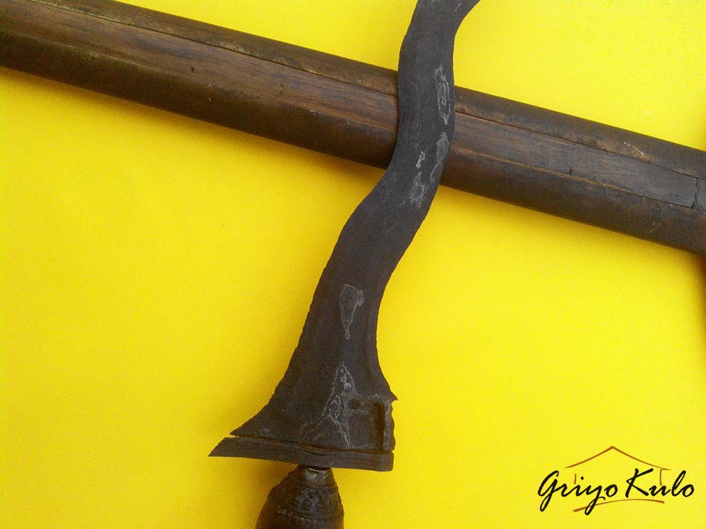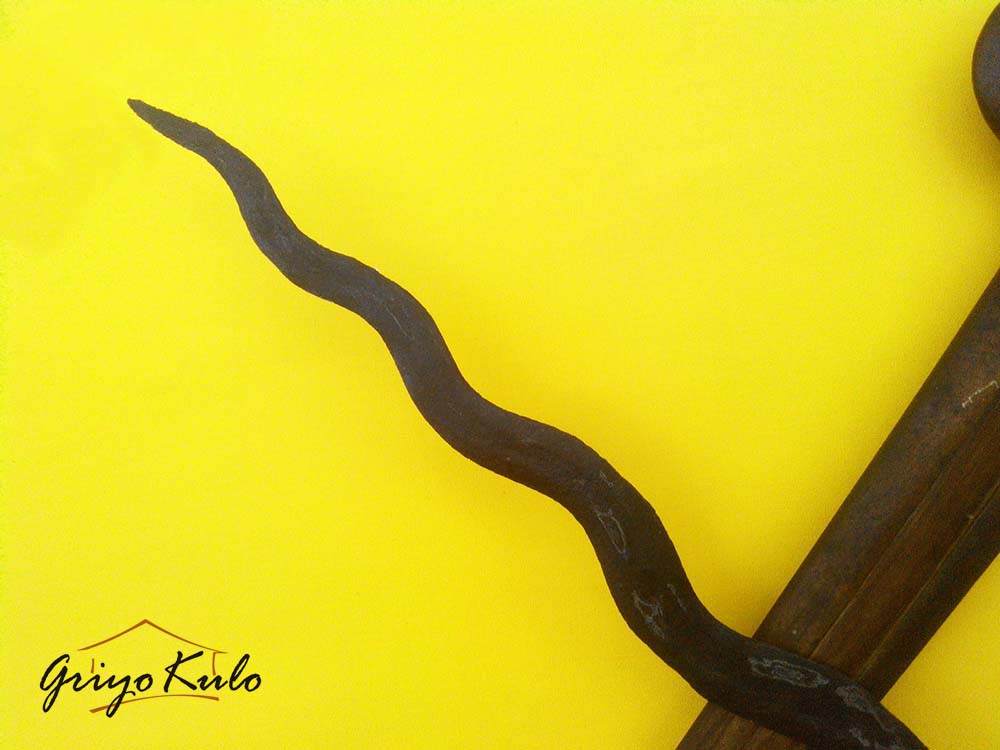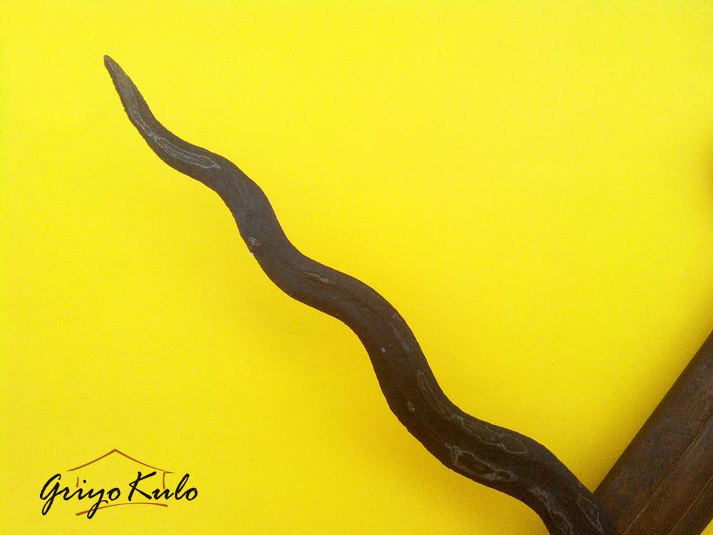 Wagu namun wangun, itulah kesan medalam pertama yang bisa dirasakan. Memang, mulai dari tarikan awal luknya hingga jatuhnya ujung keris (panitis) yang mendongak mempunyai kekhasan yang berbeda dengan langgam daerah manapun. Bentuk sekar kacang cupet dan posisi pesi yang centre di tengah bilah menambah penampilan uniknya. Jika dicermati lebih lanjut bentuk pejetan yang ada tampak dalam, serta tidak berimbang sisi kanan dan kirinya. Bagian sraweyan dan tikel alis tampak memanjang membentuk kruwingan di kanan kiri sepanjang luk pertama dan selanjutnya berganti dengan kruwingan di tengah menuju ke atas. Serat besinya halus, padat, dan tampak basah seolah membawa darah Majapahit. Begitu juga dengan tantingannya sangat ringan, jika disentil bergema nyaring pertanda ditempa melalui sebuah kematangan. Jika dilihat dari sisi pinggir (sisi tajam) meski bilah ini tergolong masih cukup tebal menampakkan lekukan-lekukan yang mengesankan tanda bekas pijitan jari tangan. Sandangan yang ada juga masih tampak wingit, bawaan sebelumnya. Patina yang ada pada pendok dan mendak-nya sengaja dibiarkan apa adanya, menambah ke-otentikan-nya. Sebuah harta karun yang beruntung masih bisa didapatkan dari pelosok dusun.