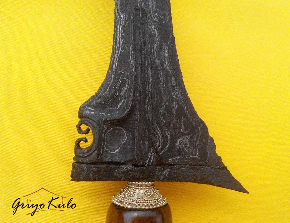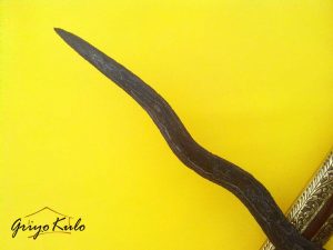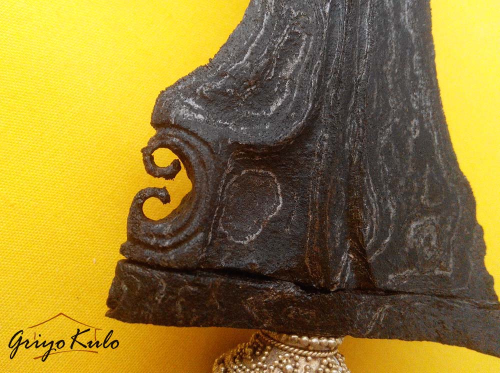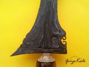 CATATAN GRIYOKULO, Karakter Madiun sangat kental pada pusaka Pandawa Panji Penganten ini. Lugu dan sederhana namun mempunyai perbawanya sendiri dan terasa ‘kuat’ di sisi esoteri. Bentuk sogokan yang tampak lurus meskipun keris ini berluk lima (biasanya keris yang mempunyai luk pada bagian sogokan belakang akan ikut menekuk sesuai luk pertamanya). Dalam hal blumbangan-nya pun seolah tak imbang sisi depan dan belakangnya. Namun tetaplah enak dipandang. Terlebih bentuk sekar kacang kembarnya yang saling berhadap-hadapan seolah membentuk tautan berbentuk jantung hati, original bukan susulan/owah-owahan. Seolah menjadi perlambang mengenai ikatan cinta abadi antara Adam dan Hawa atau Dewa Asmara (Kamajaya) dengan Dewi Cinta (Kamaratih). Terasa nyess… di hati. Adalah sebuah keberuntungan kita masih bisa menikmati warisan adi luhung dari masa lalu. Sangat pantas untuk disimpan sebagai pusaka keluarga dan diturunkan kepada lintas generasi selanjutnya.