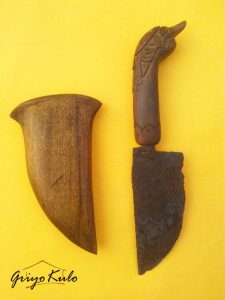 XVII …Ganggamam sang pandita ma: kala katri, péso raut, péso dongdang, pangot, pakisi. Danawa pina/h/ka dewanya, ja itu paranti kumeureut sagala… – Sanghyang Siksakandang Karesian