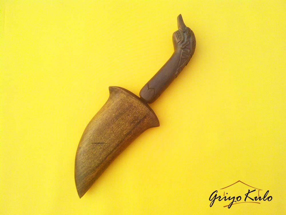 Wedung ini sudah dibuatkan warangka fungsional dari kayu waru, seratnya ulet dan sangat ringan. Tak salah jika dalam serat kawruh landheyan karya Mas Ngabehi Karya Buntara (bisa dibaca disini), kayu waru merupakan kayu terbaik untuk digunakan sebagai landeyan tombak. Mungkin karena serat kayunya tidaklah sekeren kayu lain (galihnya berwarna ungu, hanya ngeblok lurus saja), dibandingkan kayu timoho yang memunculkan banyak keunikan motif dalam peletnya menjadikannya seolah tidak menarik digunakan. Karena hulu tersisa yang sudah memfosil hancur saat proes pembersihan maka ukiran rajamala dengan model primitifan dipilih menggantikannya. Rajamala adalah ksatria berbentuk raksasa yang sakti mandraguna. Dia tidak akan mati, bila jasadnya dimasukkan kembali ke dalam air, Bila mengalami cedera fisik yang sangat parah, hanya dengan diperciki sedikit air, tubuhnya akan kembali bugar. Mitos inilah yang kemudian diambil spirit-nya.