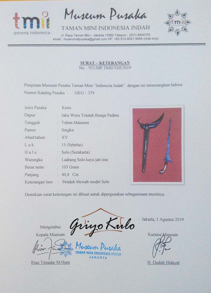 8. Keterangan Lain : ganja kinatah bunga padma, warangka dusun