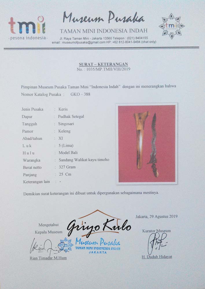 Dan bertepatan dengan HUT Museum Mpu Tantular Sidoarjo yang ke-42, pada tanggal 21 – 25 Sepetember 2016, bersama dengan keris Parungsari Sriwijaya (klik disini) dan Sengkelat Majapahit (klik disini), keris pandhawa pudhak sategal ini turut pula dipamerkan (foto no. 3 dari kanan). Selain kehadirannya membawa pemahaman baru dalam dunia kerisologi, secara khusus tentunya juga dapat menjadi kebanggaan dan kepuasan batin tersendiri bagi pemiliknya.