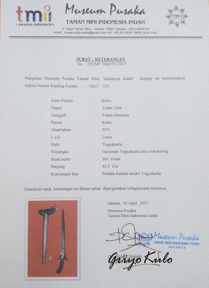 - Sertifikasi : Museum Pusaka TMII No : 255/MP.TMII/IV/2017