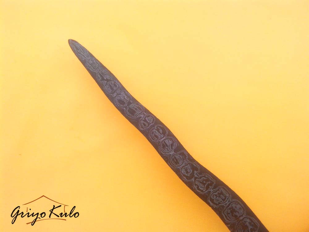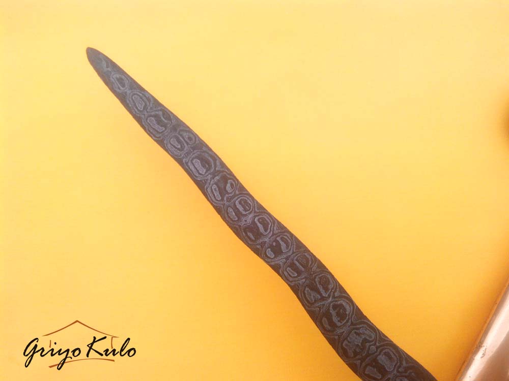 CATATAN GRIYOKULO, Secara visual, bilah keris ini tampak masih sangat utuh pada seluruh ricikan-nya. Garap luk terjaga rapi, demikian pula bentuk eri pandan/greneng yang masih jelas dan tidak aus oleh waktu. Sekar kacang melingkar halus, menempel pada gandhik, berpadu dengan pejetan dan sogokan yang tidak berimbang—sebuah ciri khas keris Madiunan yang kuat wataknya.
