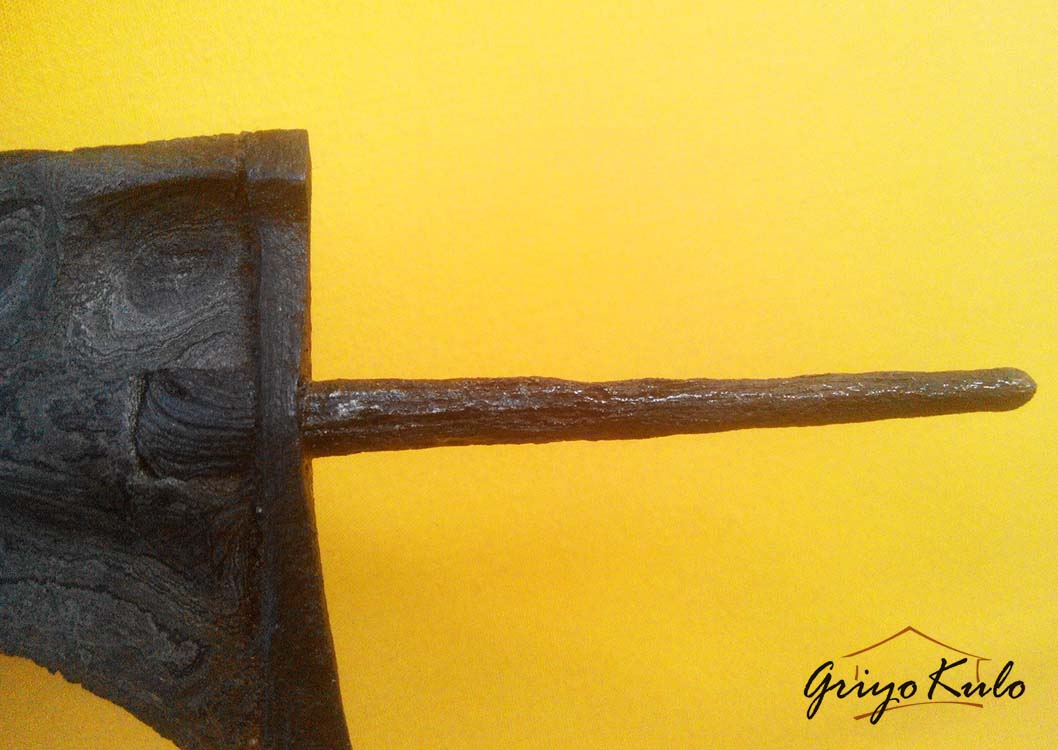 CATATAN GRIYOKULO, Mereka yang gemar menangguh keris mulai dari bagian gonjo atau mereka yang kadang “kepo” dengan isi bilah yang ada dalam warangka, penampakan wuwungan gonjo keris kidang mas ini terbilang menarik. Bentuknya yang nguceng mati dengan bagian gendok (perut) yang gendut berpadu dengan sirah cecak yang nguncup. Dari bentuk wuwungan gonjo-nya saja sudah cukup untuk menghadirkan obrolan seru mengenai tangguh. Ada yang menangguh Majapahit hingga demak, bahkan ada yang mengira keris ini ber-gonja iras.