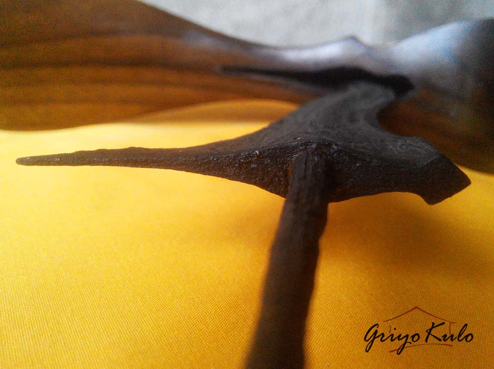 Tidak hanya bagian pesi yang unik (berbentuk gapit wayang), jika diperhatikan secara seksama pada bagian pamornya pun menampilkan guratan-guratan yang berbeda. Meski sudah tidak terlalu kontras, namun sesekali dasaran pamor miring tampak berpadu dengan pamor mlumah di beberapa area. Bentuk semacam ini di masyarakat perkerisan ada yang menyebutnya sebagai pamor golang-goling (pamor miring ditimpa pamor mlumah). Pamor golang-goling oleh sebagian orang termasuk digemari, karna dipercaya bukan buatan sembarang empu, sehingga diyakini masuk dalam duwung tataran pusaka. Di katalog Griyokulo sendiri, seingat penulis baru dua kali menghadirkan pusaka dengan model pesi gapit (sebelumnya di tahun 2016, bisa dibaca disini).